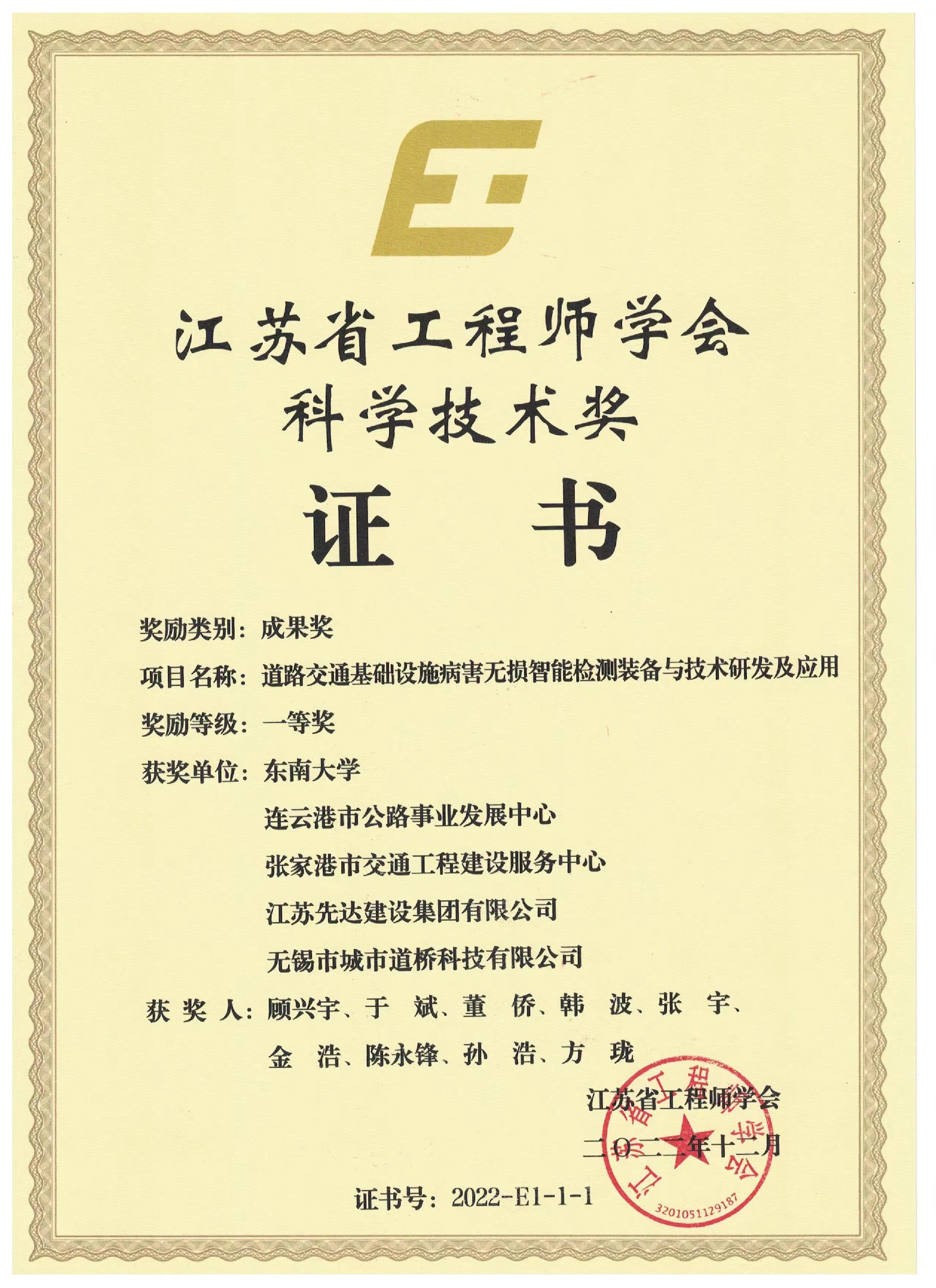 在2023年2月22日召開(kāi)的“第三屆江蘇工程師大會(huì )”上,我司參與的“道路交通基礎設施病害無(wú)損智能檢測裝備與技術(shù)研發(fā)及應用”項目被江蘇省工程師學(xué)會(huì )授予2022年度科學(xué)技術(shù)獎成果獎一等獎。